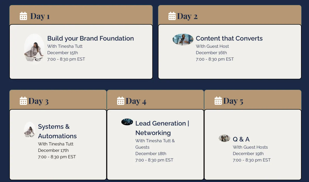 By the end of this 5-day course, you’ll walk away with a clear, confident foundation for your real estate brand and business. You’ll gain deeper self-awareness, a defined brand voice, and a crystal-clear understanding of who you serve. You’ll build your signature story, sharpen your visibility strategy, and create systems that support consistency and growth. Each day builds on the last, equipping you with practical tools, proven frameworks, and the mindset to show up with purpose, clarity, and confidence in your market. This course doesn’t just teach you what to do; it helps you become the agent your business needs you to be.